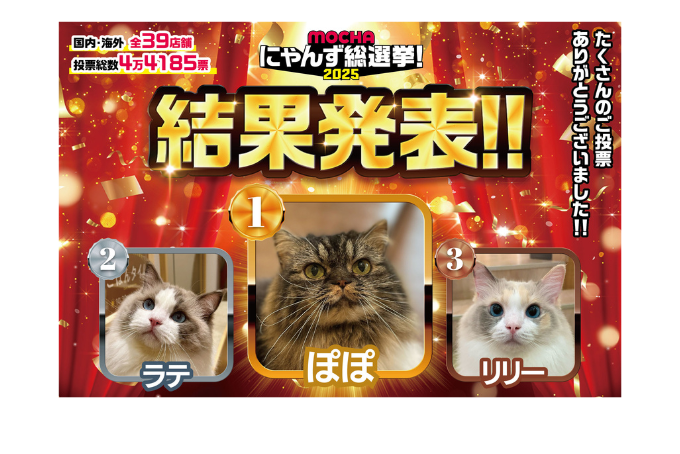 猫カフェMOCHAの人気No.1にゃんこを決定する大型イベント「MOCHAにゃんず総選挙2025」の最終結果を発表いたします。