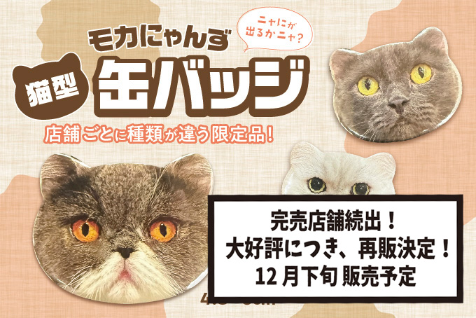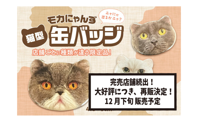 2025年11月1日(土)より全国23店舗で販売を開始した「モカにゃんず猫型缶バッジ 〜vol.1〜」は、予想を上回る反響をいただき、発売からわずか1週間で多くの店舗で売り切れが続出となりました。これを受け、多くのご要望にお応えするかたちで、このたび待望の追加販売が決定いたしました。