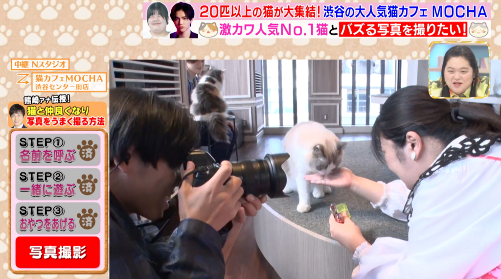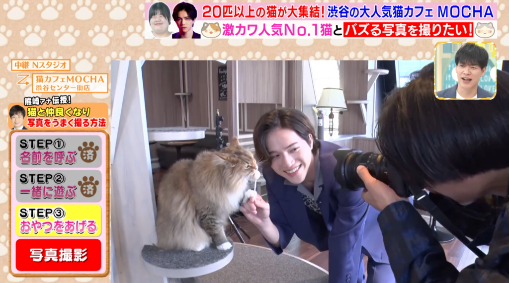 スタジオと猫カフェMOCHA 渋谷センター街店を中継でつなぎ、熊崎風斗アナウンサーや