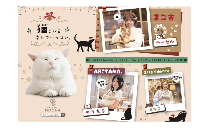今回の広告では、ホワイトクリスマスをテーマに、3名のイチナナライバーが白を基調とした衣装で登場。MOCHA渋谷公園通り店で撮影されたコラボビジュアルには、店舗で人気の猫たち「のりもち」「ヘーゼル」「きなこ」も出演し、ライバーとの息の合った一体感と癒しにあふれた世界観が表現されています。