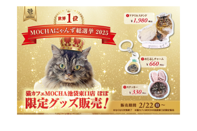 2025年に開催された「MOCHAにゃんず総選挙2025」で国内外全39店舗・総勢830匹の中から世界1位に輝いた、猫カフェMOCHA池袋東口店の人気猫「ぽぽ」。その記念すべき瞬間を祝し、特別な装いをまとった姿を推し活として楽しめる記念グッズを、猫カフェMOCHAラウンジ池袋東口店限定で発売いたします。