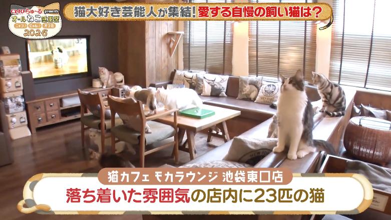 2026年2月22日(日)の「猫の日」に放送された、BSフジ25周年特別番組『CIAOちゅ〜る presents オールねこ感謝祭!ニャン♪にゃん♪オフ会 2026』にて、猫カフェモカラウンジ 池袋東口店が撮影地として使用されました!